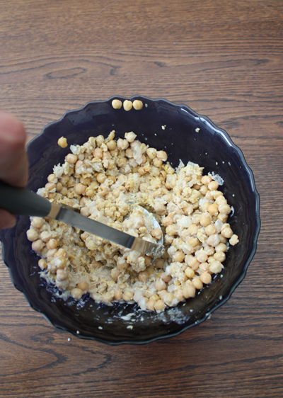- Egoutte les pois chiches et verse-les dans un saladier au fond large. C’est important pour pouvoir les broyer facilement.